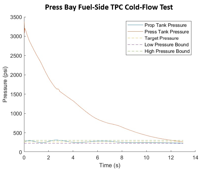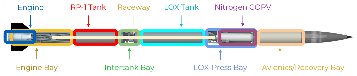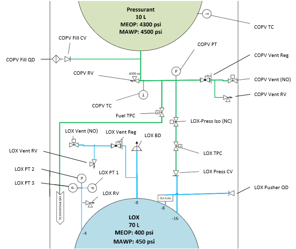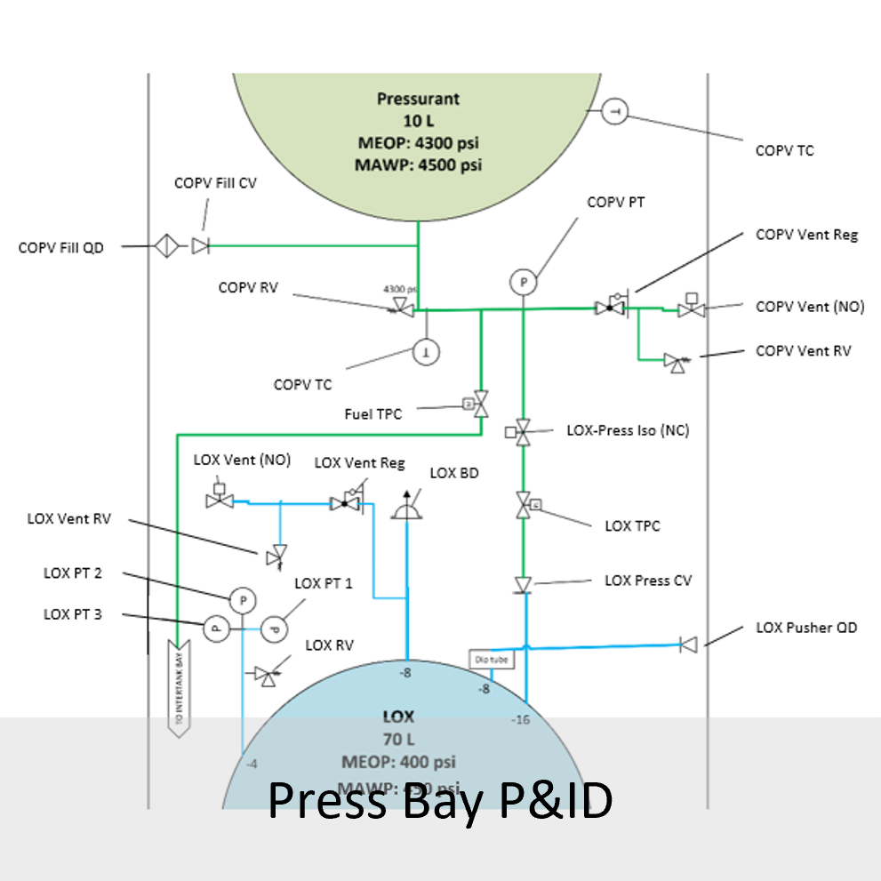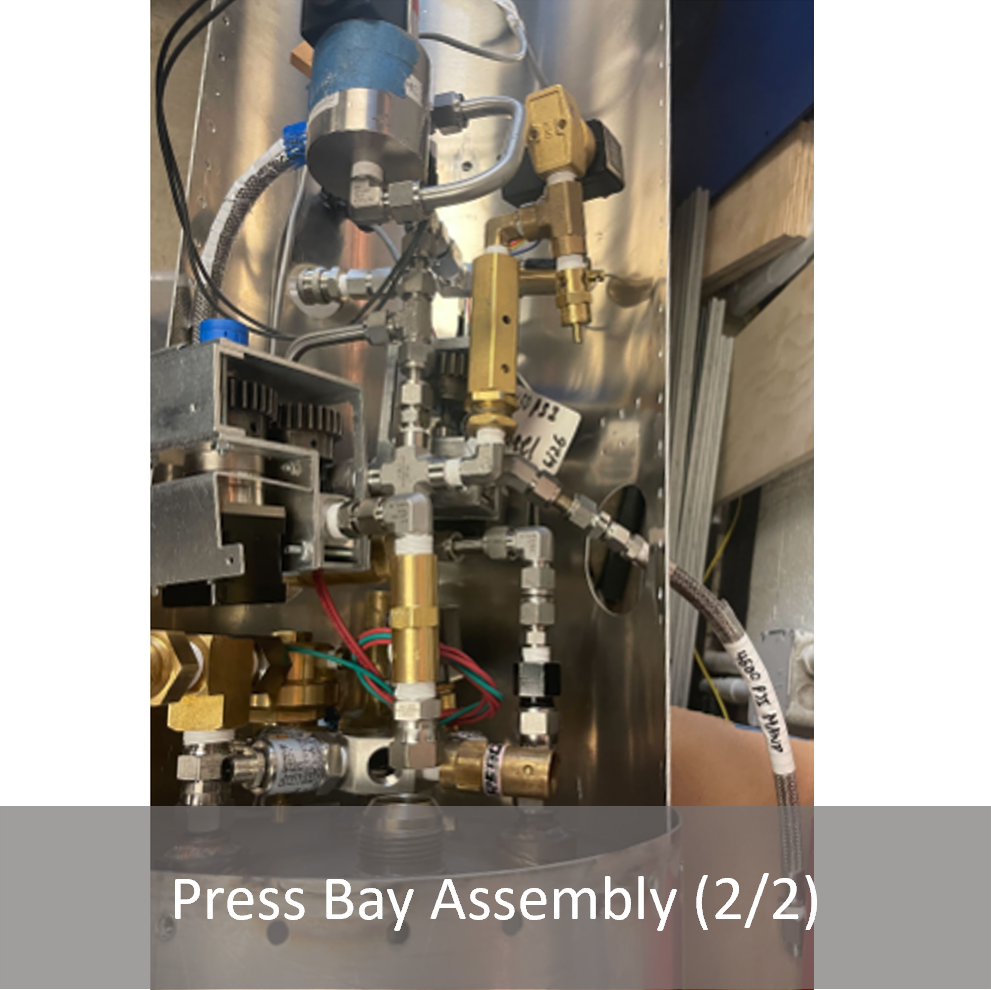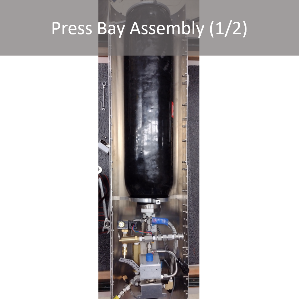 The Press Bay was the portion of the rocket between the Avionics bay and the LOX tank designed to house the flight COPV, two custom motorized needle valves for regulating propellant tank pressures, and all of the piping and instrumentation related to propellant tank pressurization, COPV and LOX tank over pressurization prevention, and ground support COPV fill + vent and LOX tank vent systems. The Press Bay airframe clocking was requirements were driven by FAR site launch rail dimensions, while several safety requirements were also driven by site guidelines.