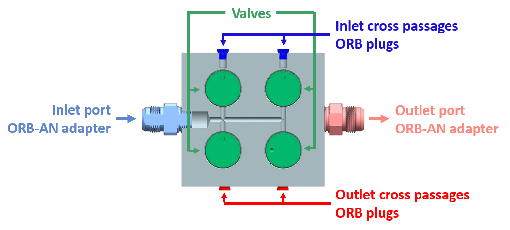 Intersecting flow passages made by drilling 2x blind holes into block faces perpendicular to inlet/outlet ports, then tapping the holes for ORB plug fittings
