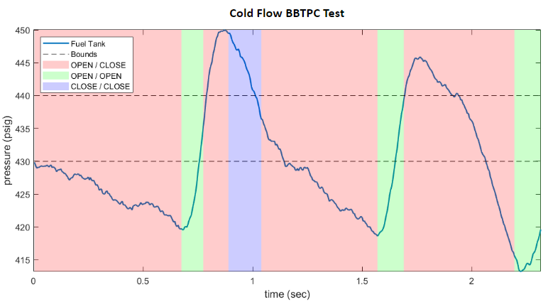 Bang-bang Tank Pressure Control (BBTPC) is a favorable solution for throttling of pressure-fed liquid rocket engines due to mechanical simplicity and inherent robustness to unsteady system dynamics. It maximizes engine efficiency by accurately maintaining optimal propellant tank pressures across a broad range of pressure drops. As part of the UM rocketry team MASA, I designed, fabricated, and tested BBTPC hardware for a kerolox rocket engine.