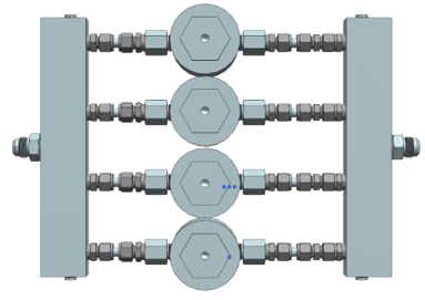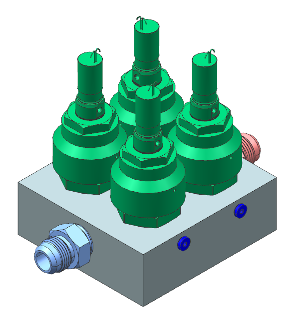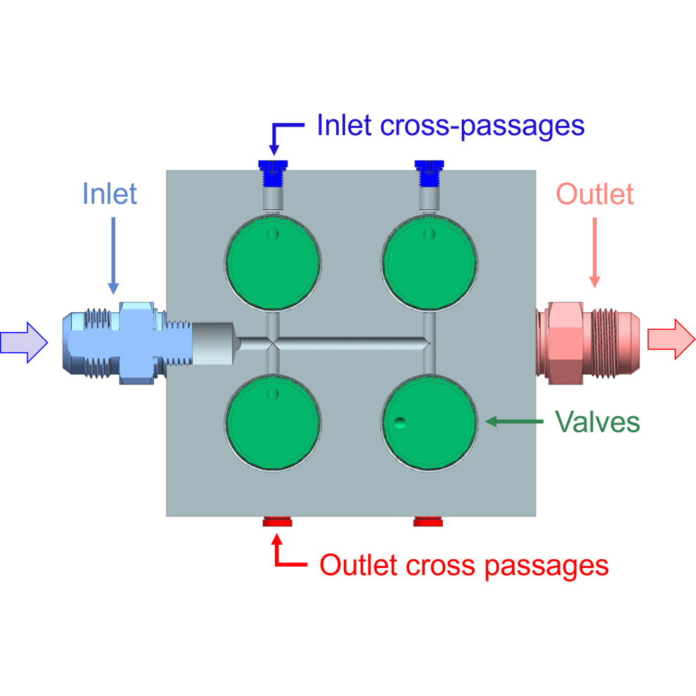 Cartridge-style valves mounted in manifold block reduces system volume by 79% and mass by 39% (relative to the GSE design described below)