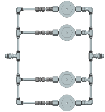 Limited Tescom supply and time constraints required ordering valves of various port sizes, raising concern that flow may distribute unevenly between parallel paths