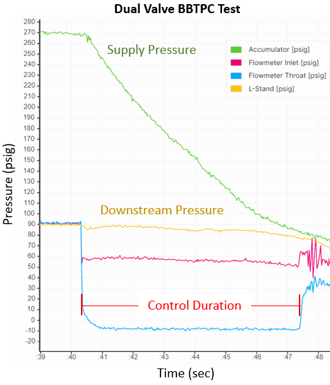 In preliminary testing, the system worked as anticipated for both single and dual valve configurations (shown right). During the full-scale integrated cold flow test (shown below) however, large oscillations in the downstream tank pressures were observed. After reviewing the data, we arrived at the following conclusions: